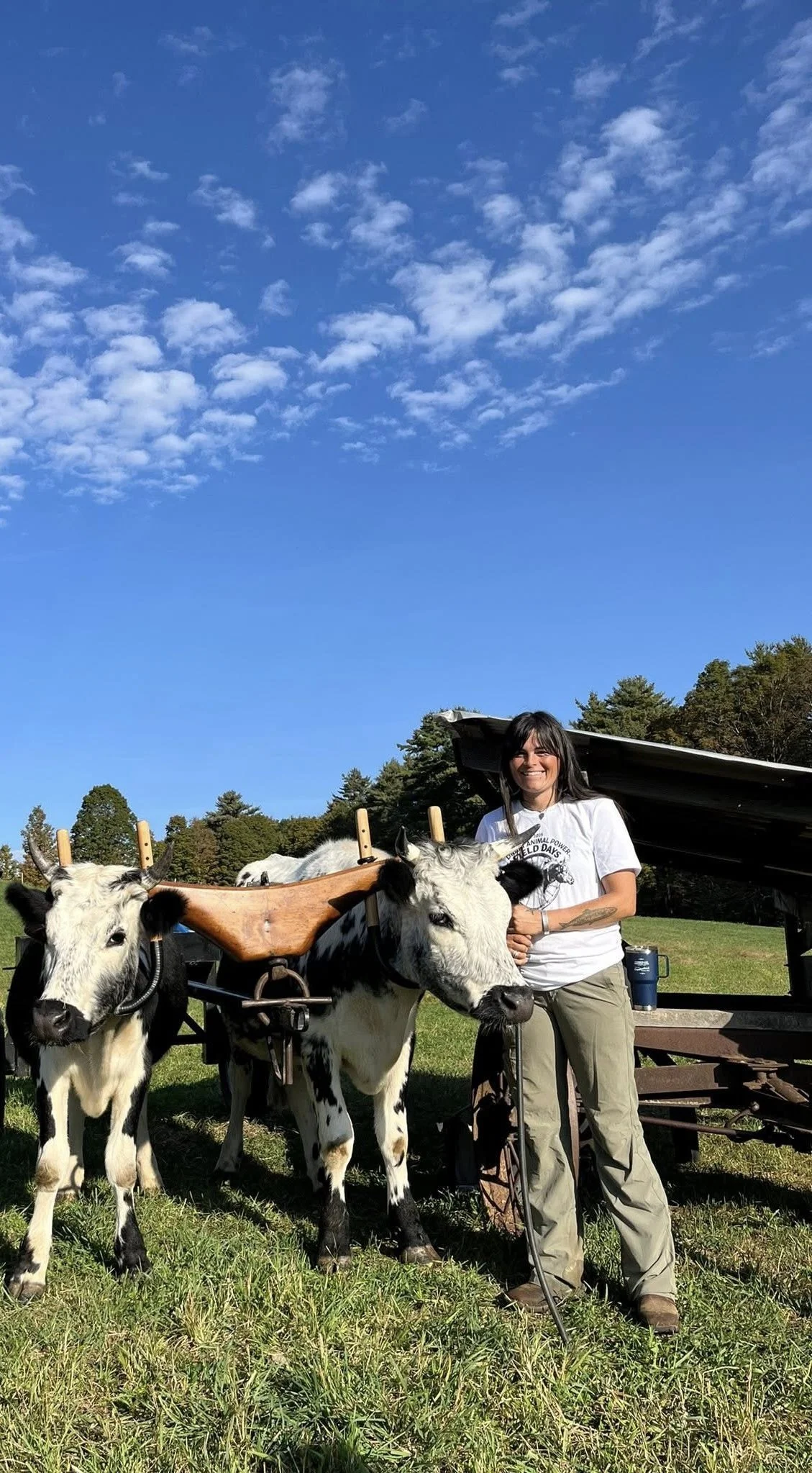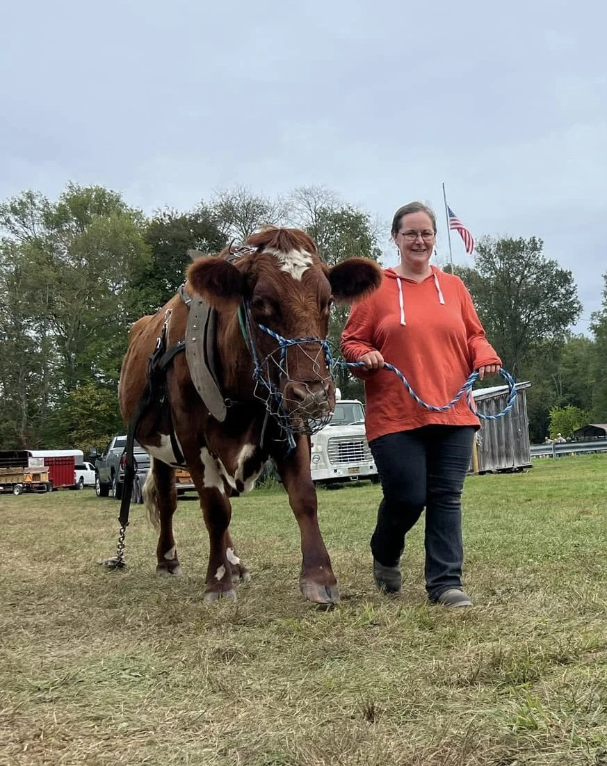 Cindy was introduced to horses at a young age in 4-H and Pony Club, competing in eventing and combined driving for many years. She then discovered oxen in 2015, and now has her own team of milking shorthorn oxen living in Edgecomb, Maine. She's excited about draft animal education whether for young people or older people. She's involved with her local 4H group, recently helping the students make yokes for their calves. She's made connections with other ox-enthusiasts from Tiller's International in Michigan to The Lauresham Museum in Germany (and that was just in 2024.) She's all about hands-on learning and about helping folks find the right setup that works for them and their animals.