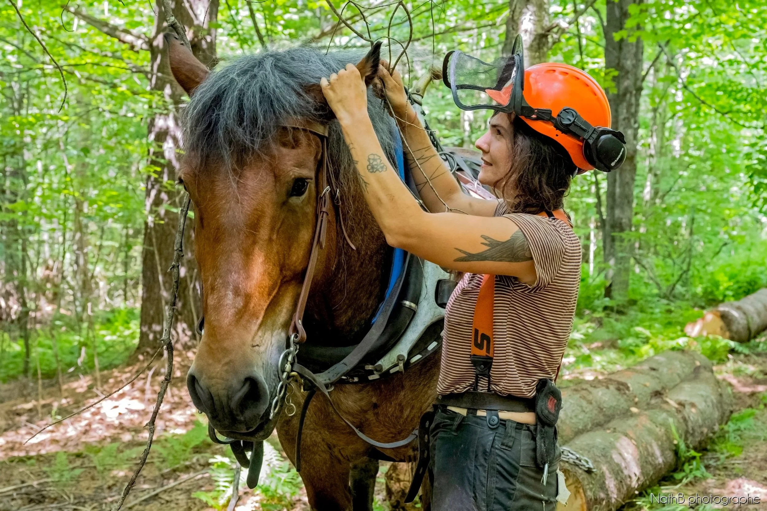 Daphné was born and raised in Paris and she started riding horses at a very young age. After moving to Quebec, she did a three year program in growing organic fruits and this is how she met Paul Chaperon and his family during an internship. He became her mentor and gave her the opportunity to use horses everywhere on a farm. From doing loose hay, logging, seeding, plowing and much more, it revealed her passion for working horses. She started her own small-scale logging business after buying one of her mentor’s horses, Fred. Using a single horse, the goal of her new project is to harvest wood in an ecological and thoughtful way.